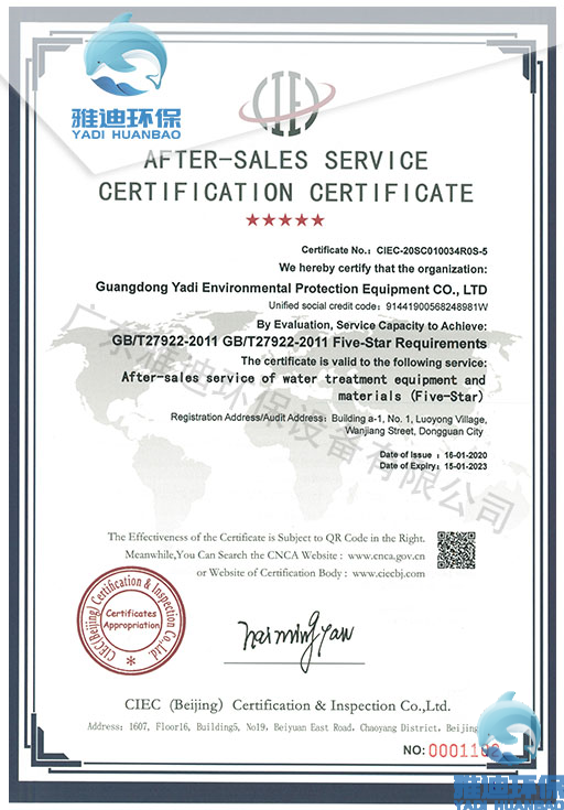 五星售后服务认证证书-英文-雅迪环保